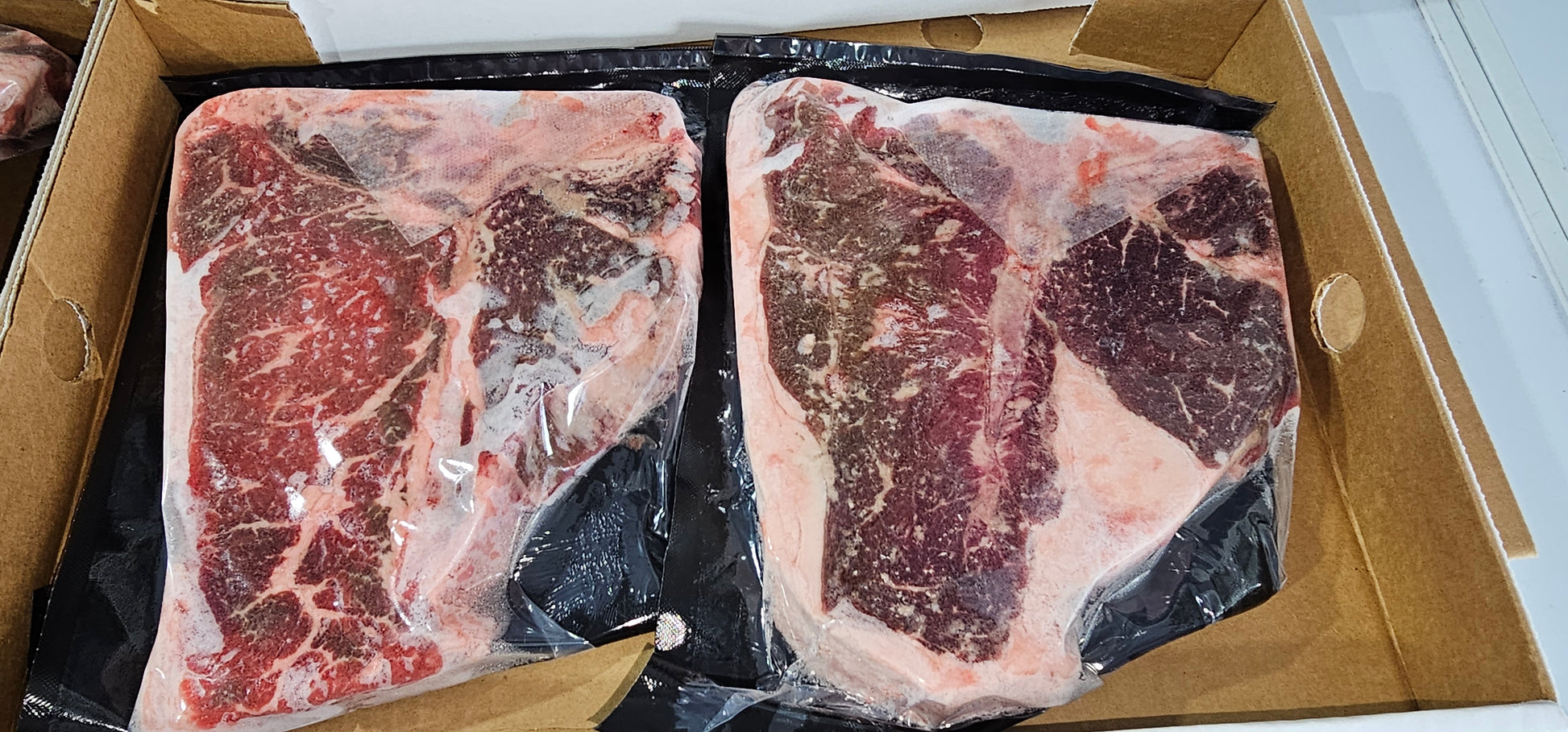 (2) Porterhouse Steaks: A tasty combination of tenderloin and strip, great for grilling or pan-frying.
